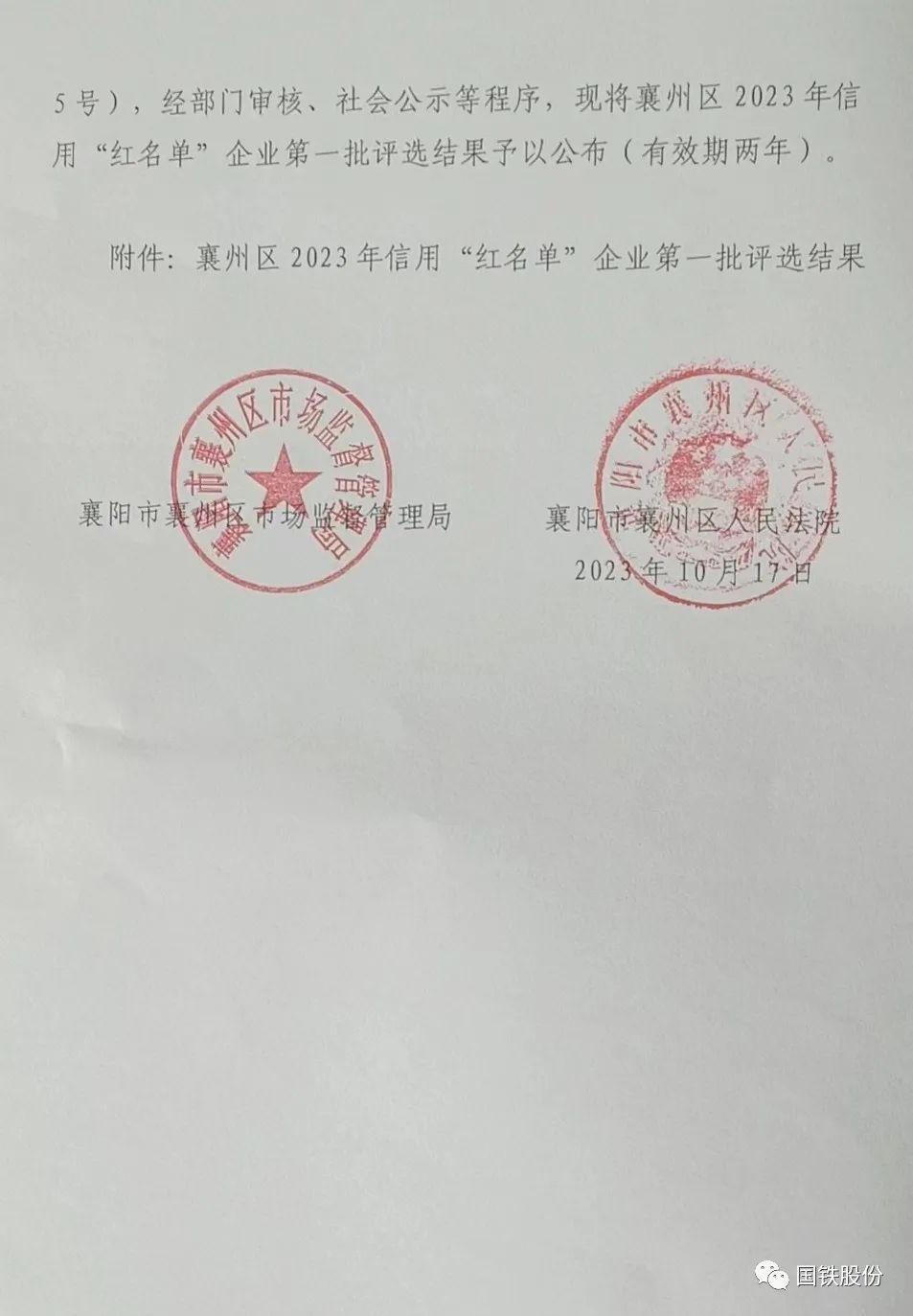【喜報】國鐵機電獲“襄州區2023年信用‘紅名單’企業”榮譽